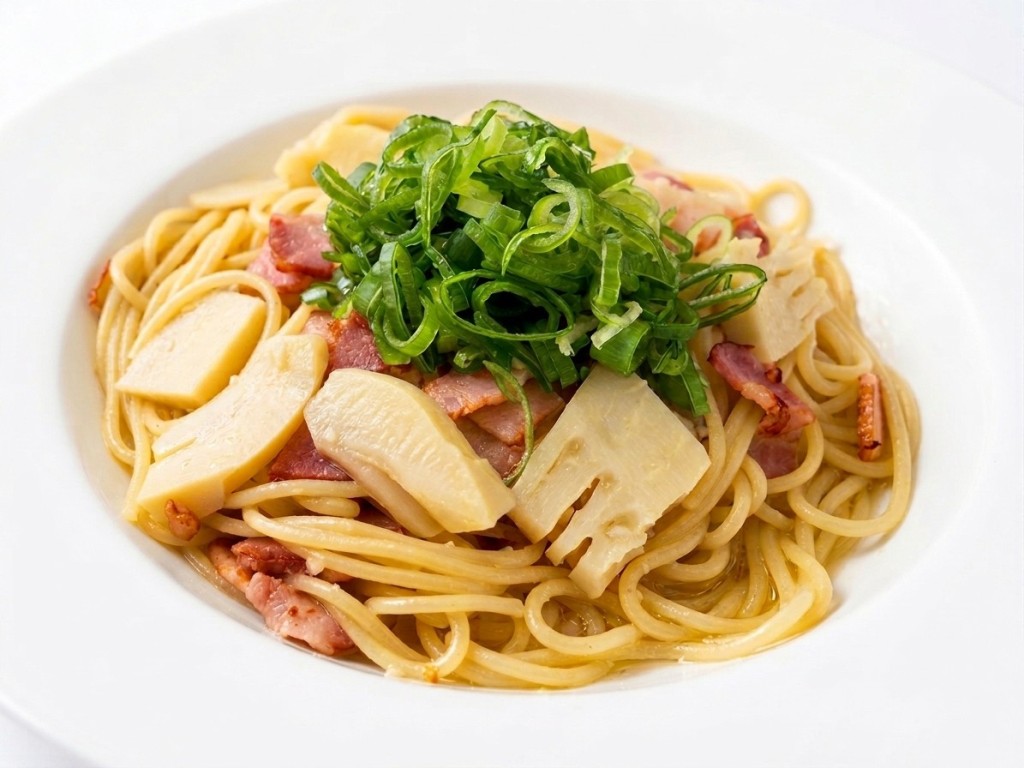 秋の味覚しめじと、緑豊かなホウレン草に、海老と燻製鶏むね肉が入った豆乳クリームソースのパスタ。